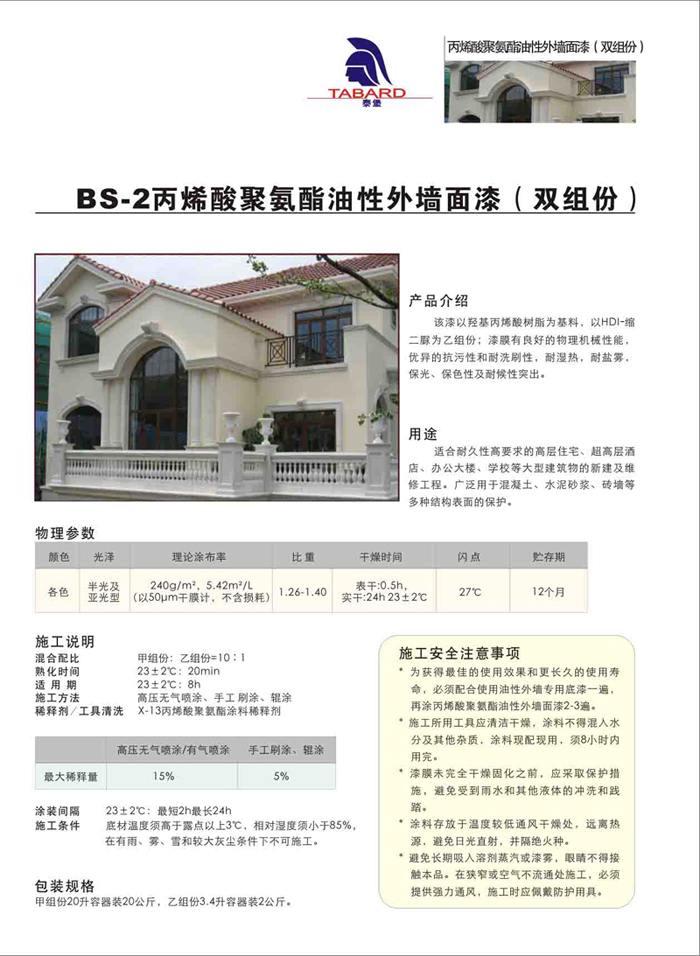 由丙烯酸树酯、触变剂、颜填料、溶剂等组成,属物理干燥型;漆膜具有极佳的耐候性、耐磨损;其防水性能及耐洗刷性能优异,具有极佳的抗污性和自清洁能力。与水性外墙漆相比,漆膜更加致密、、耐候性更强,是一种民用、商业、工业建筑都广泛使用的涂料。