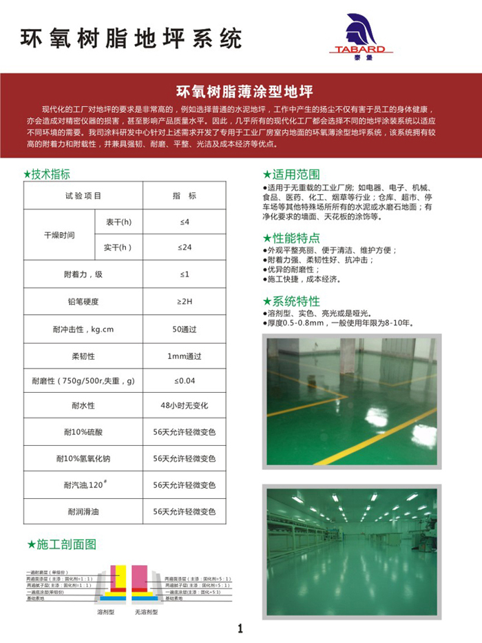 1、适用范围:适用于无重载的工业厂房;如电器、电子、机械、食品、医药、化工、烟草等行业;仓库、超市、停车场等其他特殊场所所有的水泥或水磨石地面;有净化要求的墙面、天花板的涂饰等。