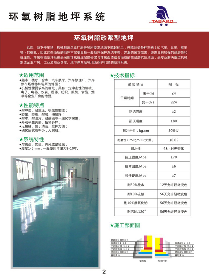 3、系统特性:溶剂型、实色、亮光或是哑光;厚度1-5mm,一般使用年限为8-10年。