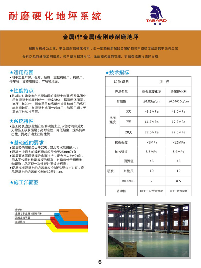3、系统特性:施工简便,直接撒播在新鲜混凝土上,节省时间和劳力,无需施工砂浆面层;高耐磨性、降低起尘、提高抗冲击性、提高抗油主油脂性能。